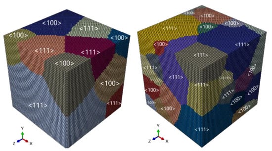 Here, is the stress tensor. A general framework for the mechanical analysis is provided in our previous research [,]. As per Reference [], the edge size (Lo) of a cubic box used to represent the polycrystalline aggregate is calculated as: