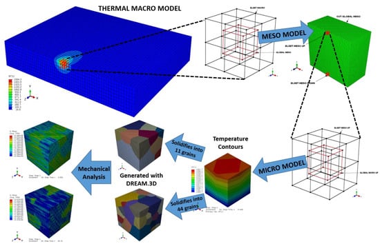 A physically based multiscale model constructed to simulate the influence of the thermal cycle in the entire welding process can provide new understanding of the microstructure and distortion evolution. The multiscale frame covers thermal, micromechanical stress, and failure analysis of extended microstructural regions. In recent investigations [,], dendritic morphology evolution, micro residual stresses, and dislocation evolution have been integrated into a fluid-thermal-metallurgical-mechanical multiscale approach. Here, in order to mesh a local part of the model with a refined mesh based on interpolation of the solution from an initial coarse thermo macro global model (see Figure 3), the sub-modeling technique (a flexible strategy used to calculate temperature gradients, plastic strains and residual stresses to any number of levels) was used. The meso-sub-model is the global model for the subsequent micro sub-model. With the multiscale submodeling approach, weld pool features at the macro- and meso-cale level, and micro residual stress and secondary dendrite arm spacing features at the micro scale level can be easily obtained. The prediction of the distribution and evolution of even microscopically small crystal defects such as dislocations, is another advantage of the proposed multiscale model.