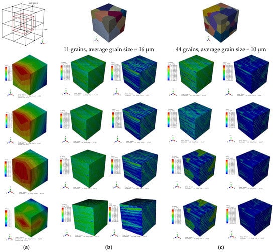 Three-dimensional arrangements of grains are idealized to represent polycrystalline aggregates. Many elements per grain are used to represent nonuniform deformations within individual grains, seen as domains separated by high misorientation boundaries. In order to calculate macro and micro variables of stress and strain, the finite element mesh of the polycrystal is loaded by prescribed driven (load) boundary conditions. It better understood if the features of the material microstructure are considered in the modeling framework [,,]. Grain-scale three-dimensional mechanical modeling of polycrystalline materials provides valuable information for the design of improved materials. Materials with randomly oriented grains are isotropic, whereas materials with texture are anisotropic. Cubic crystals and textured polycrystals are anisotropic with respect to strength, Young’s modulus, creep, and plastic flow. When an isotropic material is elastically deformed, the Young’s modulus is the material property that relates stress and strain. In metals, anisotropic elasticity behavior is prevalent in all single crystals.