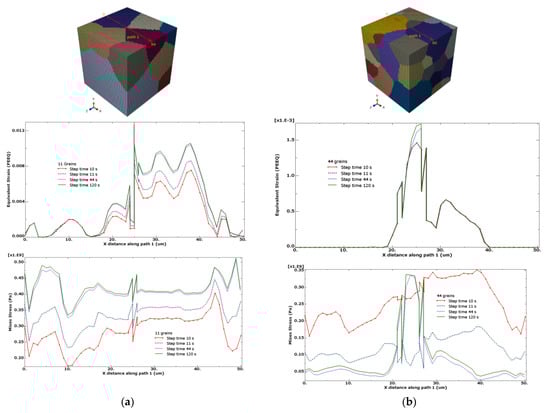 Equivalent strain (PEEQ) and Mises stress vs. X distance along path 1 at documented step times (a) for the 11 grains specimen (b) for the 44 grains specimen.