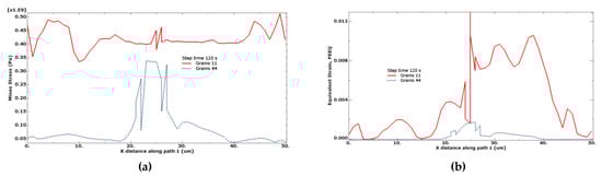 The influence of the grain size on the aggregate response in terms of plastic strain and local stress variations are presented in Figure 5 and Figure 6. In Figure 5b related to the 44 grain sample, it is observed that the Mises stresses decrease as the step time increases. That is, highest Mises stresses evolved in small time intervals, and as the step time increases, these stresses decreased. However, an exception to this generalized behavior occurs in the central part of the analyzed path 1 where many grains come together (see the central top surface in the 44 grains sample of Figure 2). The opposite behavior is observed in Figure 5a related with the coarse grain sample of 11 grains, where withouth any excepcion, the evolution of both, plastic deformations and Mises stresses increases as the step time increases. Higher Mises stresses evolved in the sample with coarse grain size (11 grains, dgr = 16 µm), which indicates that the strong dependence of residual micro stresses on grain size was reversed. The averaging of the grain orientations over all grains in the textured polycrystal with greater number of grains occurred and the strength was diluted by the spread of orientations present.