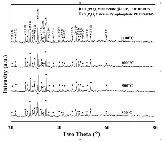 XRD patterns of β-TCP powders calcined at temperatures of 800, 900, 1000, and 1100 °C.