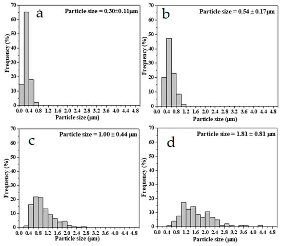 In this study, the particle size range of calcined β-TCP powders was from 0.3 to 1.8 μm, which agrees with the common particle size range of dry-particle (without calcination) from 0.5 to 50.0 μm [24]. Furthermore, the SEM images indicate that the variation of particle size depends on the calcination temperature. It is well-known that the particle size is controlling to the droplet size in the spray drying process. The main factors controlling the droplet size, including precursor concentrations (droplet density) and the speed of the rotary atomization system [15], were maintained constant in this study. Ideally, four powders should have a similar particle size before calcination. Therefore, the different particle sizes are mainly attributed to the calcination process. From the particle statistical data (see Figure 3), the average particle size increases with the increasing calcined temperature (0.3 μm for the 800 °C calcined powder and 1.8 μm for the 1100 °C calcined powder). A possible reason for this is the particle coarsening that takes place during the high-temperature calcination process. Detailed SEM micrographs (Figure 2) show that the powder surface curvature decreased when the calcination temperature increased, which supported the particle coarsening [25].