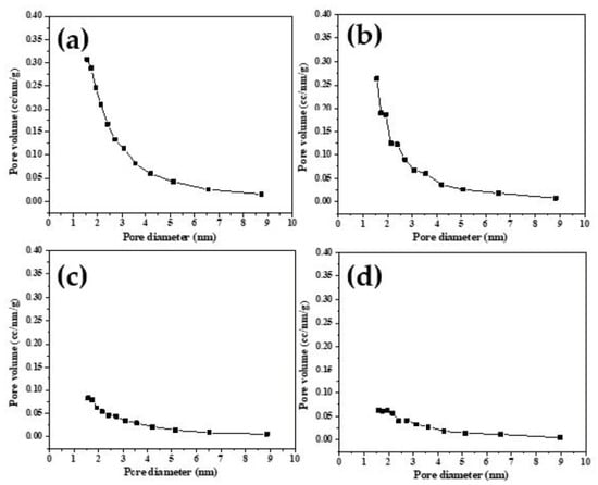Pore size distributions of β-TCP powders calcined at temperatures of (a) 800, (b) 900, (c) 1000, and (d) 1100 °C.