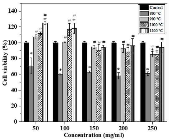 MTT assays of β-TCP powders calcined at temperatures of 800, 900, 1000, and 1100 °C (* presents the statistical differences with respect to the control, n = 3, and p < 0.05; # presents the Scheme 800 °C calcined β-TCP powder).