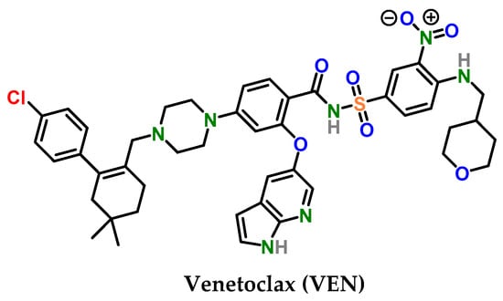 The B-cell lymphoma-2 (BCL-2) family of proteins, consisting of three distinctive protein groups (anti-apoptotic proteins, pro-apoptotic effectors, and pro-apoptotic initiators/sensitizers), regulate cell death through their direct binding interactions triggering a mitochondrial apoptotic pathway that results in caspase activation and apoptosis [1,2,3,4,5,6,7,8,9,10,11,12,13,14,15,16]. BCL-2 anti-apoptotic family members play a key role in cancer cell survival as well as in drug resistance [17,18,19,20,21,22]. Therefore, they are primary inhibition targets for the treatment of several cancers as their inhibition restores the apoptotic ability of malignant cells [23,24,25,26,27]. Venetoclax (Figure 1) is an orally bioavailable, B-cell lymphoma-2 (BCL-2) selective inhibitor and the first-in-class oral BCL-2 inhibitor for the treatment of lymphoid malignancies [28,29,30,31,32,33,34,35]. Venetoclax was first approved by the FDA in 2016 for the treatment of patients with chronic lymphocytic leukemia (CLL) and later for small lymphocytic lymphoma (SLL) and for the treatment of newly diagnosed acute myeloid leukemia (AML) in combination with azacitidine, decitabine, or low-dose cytarabine [36,37,38,39]. According to the IMS Health data, the market value of venetoclax accounted for nearly USD 735 M in 2019. Moreover, there are many ongoing clinical trials involving venetoclax in various combination therapies [40], which puts venetoclax on the list of highly valuable drugs.