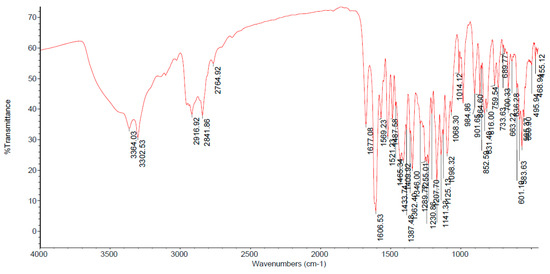In the IR spectrum of venetoclax hydrate (Figure 2) the most diagnostic bands are associated with the shoulder of an OH band of water in the 3700–3400 cm−1 region, N–H stretching vibrations (3364 and 3303 cm−1), C–H stretching vibrations of the benzene rings (3141 and 3105 cm−1), C–H stretching vibrations of CH2 and CH3 groups (2917 and 2842 cm−1), C=O stretching vibration of an amide bond (1677 cm−1), and stretching vibrations that are probably associated with C=C aromatic rings, the –NO2 group, and the –SO2 group (1607, 1569, 1521, 1362, 1346 and 1141 cm−1).