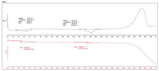 The thermal behavior of the obtained crystalline venetoclax is shown in Figure 4. In the DSC thermogram (Figure 4, top), two endothermic transitions were observed: the first transition at 49 °C (onset) and 64 °C (peak), which is probably associated with partial dehydration, and the second transition at 168 °C (onset) and 182 °C (peak), which is probably associated with the melting of the form obtained after dehydration. After both endothermic phenomena, an exothermic transition peak associated with decomposition was observed at temperatures above 220 °C. The TGA thermogram (Figure 4, bottom) indicates that dehydration starts above 30 °C and the mass loss is completed by 200 °C. The mass loss of 1.92% w/w is well within the expected value for a monohydrate form, i.e., 2.03% w/w. Thus, TGA and DSC data on the obtained crystalline solid venetoclax indicated that this is a hydrated form of venetoclax.
