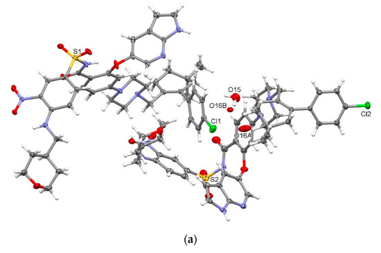 Needle-shaped crystals of venetoclax, suitable for single crystal X-ray diffraction, were prepared by crystallization from an ACN-aqueous ammonium bicarbonate buffer system. Thermal analysis and X-ray data indicated that the crystals obtained represented a venetoclax hydrate form [42] that was previously described only in the patent literature and characterized solely with a p-XRD analysis. Crystallographic data are listed in Table 1 (see supplementary materials for further details). The compound VEN·H2O crystalizes in triclinic space group P–1 with two crystallographically independent molecules of venetoclax (A and B) and two molecules of interstitial water in the asymmetric unit, with one (O16) being disordered over two positions (Figure 6a). In each molecule (A and B), intramolecular N–H⋯ONO hydrogen bonding between the amine group (N3, N10) and nitro group, as well as intramolecular N–H⋯O hydrogen bonding between the amide group (N1, N8) and phenyl oxygen atom (O7, O14), are present and stabilize the molecular structure (Table 2, Figure 6b,c).