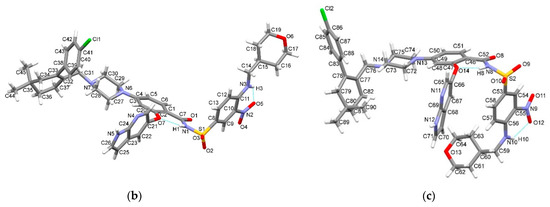 (a) Thermal ellipsoid figure of an asymmetric unit of VEN·H2O drawn at the 30% probability level. Asymmetric unit contains two crystallographically independent molecules of venetoclax and two water molecules (O15, O16 in disorder). (b) Molecule A and (c) molecule B of VEN·H2O with an atom numbering scheme. Intramolecular hydrogen bonds are drawn with dashed blue lines.