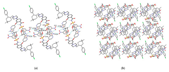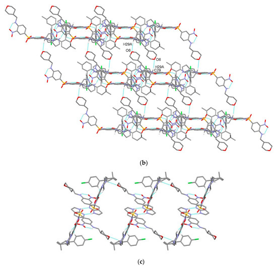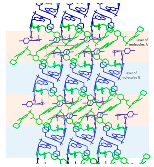 Molecule A forms a hydrogen bonded centrosymmetric dimer via N5–H5⋯N4i interactions between adjacent 1H-pyrrolopyridine moieties with the graph-set motif R22(8) [61] (Table 2, Figure 8). Dimers are further connected into a chain along the a-axis via C27–H27A⋯O4iii interactions between the piperazine moiety and nitro group as well as via C39–H39A⋯O1iii interactions between the chlorophenyl ring and the amide oxygen atom forming a graph-set motif R22(19). This interaction is supported by almost parallel π⋯π interactions between each ring of the 1H-pyrrolopyridine moiety and the nitrophenyl ring of the adjacent molecule with a centroid-to-centroid distance of 3.8869(13) and 3.8873(12) Å and ring slippage of 2.037 and 2.016 Å, respectively. Moreover, ONO⋯π interactions are present between the nitro group and the pyridine ring of the 1H-pyrrolopyridine moiety with an O⋯π distance of 3.0931(19) Å. The chains are further connected into a layer along the ab-plane via C29–H29A⋯O6iv interactions between the piperazine moiety and the tetrahydropyrane oxygen atom of the adjacent molecule.
