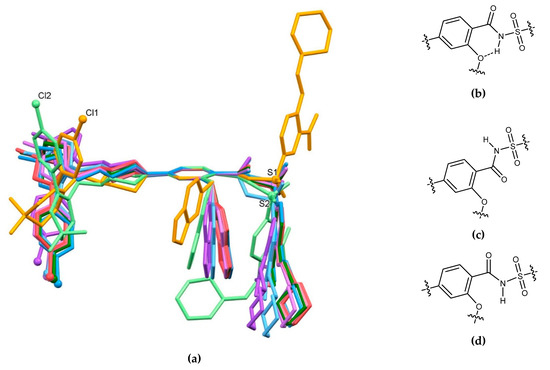 (a) Superposition showing the difference in conformation of venetoclax molecules in VEN·H2O (A—orange, B—light green) from this work and venetoclax molecules from the BCL-2:venetoclax complex (A—blue, B—light blue), BCL-2 G101V:venetoclax complex (A—red, B—pink), BCL-2 G101A:venetoclax complex (green), and BCL-2 F104L:venetoclax complex (A—magenta, B—light magenta) from Birkinshaw and Czabotar [41]. For clarity, hydrogen atoms are omitted, and Cl and S atoms are drawn as small spheres. Differences in the orientation of the sulfonylamide moiety in (b) VEN·H2O versus (c) most of the protein:venetoclax complexes and (d) molecules of B in BCL-2 and in BCL-2 G101A.
