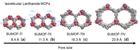 Crystal structures of SUMOF-7I (a), SUMOF-7II (b), SUMOF-7III (c), and SUMOF-7IV (d). The diameters of the corresponding pore apertures are 8.4, 11.3, 16.3, and 23.9 Å, respectively (taking into account the van der Waals radii of the atoms) [60]. Reproduced from ref. [60] with permission from the American Chemical Society, copyright 2015.