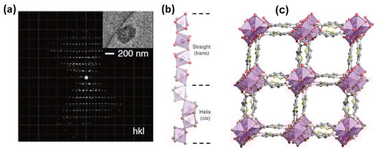 Three-dimensional electron diffraction (3DED) techniques have been developed to overcome the size limitation imposed by SCXRD, which have been shown to be powerful for ab initio structure determination of nano- or submicron-sized crystals. Electrons interact much stronger with matter than X-rays do. By taking this advantage, therefore, ED data with a high signal-to-noise ratio can be obtained even for tiny crystals. During the past two decades, several research groups have independently developed different protocols of 3DED [34,35,36,37,38,39,40,41,42,43,44]. The principle of 3DED is to tilt the crystal around the goniometer axis in a TEM and record two-dimensional (2D) ED pattern at each tilt angle. Reconstructing the 2D ED patterns at different angles into a 3D reciprocal lattice allows for the determination of unit cell and space group. Further indexing the reflections and extracting their intensities provide the basis for determining the crystal structure by using e.g., direct methods, charge flipping, etc. Various studies have demonstrated that 3DED methods can effectively and accurately determine different kinds of structures of MOFs [45,46,47].