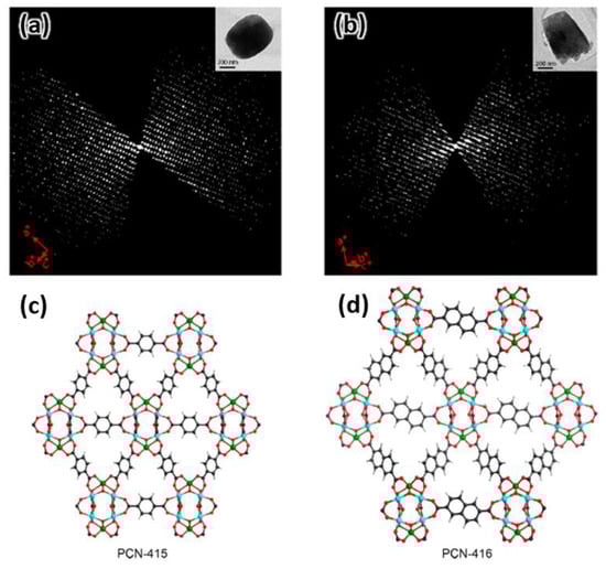Reconstructed 3D reciprocal lattice of (a) PCN-415 and (b) PCN-416 from cRED data. Insets are the crystals from which the RED data were collected. (c) and (d) Structure of PCN-415 and PCN-416 built from [Ti8Zr2O12(RCOO)16] clusters and different carboxylate linkers [85]. Reproduced from ref. [85] with permission from the American Chemical Society, copyright 2018.