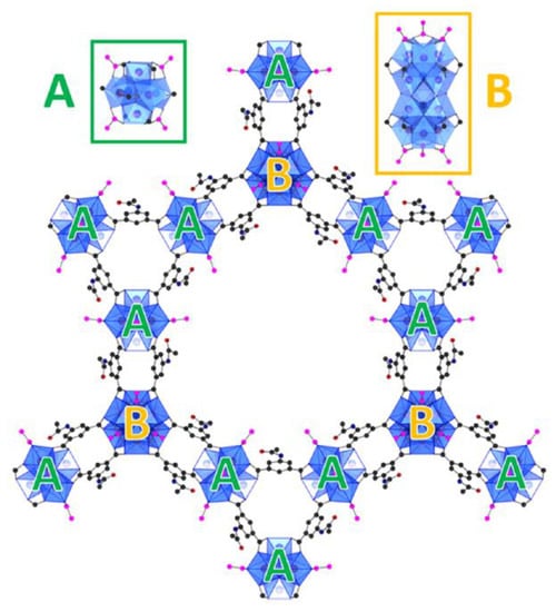Inorganic building units (IBUs) of CAU-45 and interconnection to a layered motive via 5-acetamidoisophthalate ions. (A) Hexanuclear clusters. (B) Dodecanuclear clusters. Zirconium−oxygen clusters: blue; linker carbon: black; acetate carbon: pink; oxygen: red; nitrogen: dark blue; hydrogen: not displayed [93]. Reproduced from ref. [93] with permission from the American Chemical Society, copyright 2020.