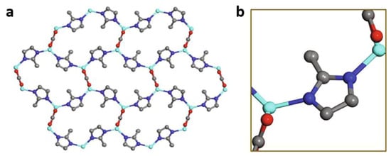 Comparison between the structural model of BSA@ZIF-C refined from cRED data and that of ZIF-CO3-1 from SCXRD data [95]. (a) The structures are stacked together, viewed along the c-axis. (b) An enlarged figure shows the connection of a mIM linker to Zn(II) cations, illustrating the accuracy of the model obtained from the cRED data. Blue spheres: N; red spheres: O; gray spheres: C; cyan spheres: Zn atoms. Reproduced from ref. [95] with permission from the Royal Society of Chemistry, copyright 2021.