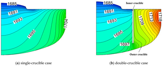 Temperature distributions (K) in the melt: (a) the case with the conventional single-crucible method, (b) the case with the double-crucible method.