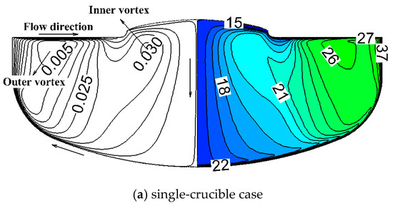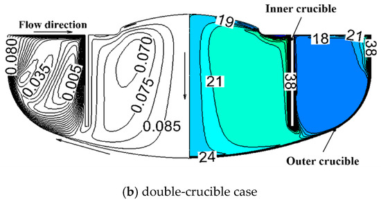 The stream function and O concentration in the melt in the single-crucible and double-crucible cases are shown in Figure 3. The O distribution patterns in the melt were similar to the melt flow patterns, which indicates that the O transportation is affected by the melt flow remarkably. For the single-crucible case, there were two vortexes in the melt, which were driven by thermal buoyancy, as shown in the left part of Figure 3a. Oxygen impurities dissolved from the crucible bottom wall were transported to the crucible sidewall by the melt flow, resulting in a high O concentration near the crucible sidewall. Then, with the interaction between the outer and inner vortexes, oxygen impurities were transported to the m-c interface by the inner vortex. A low O concentration zone was, therefore, located right under the m-c interface. Compared with the high O concentration near the crucible wall, O concentration under the m-c interface decreased by about 60%. Obviously, the flow patterns in the single-crucible case are beneficial to reduce the O concentration at the m-c interface. While for the double-crucible case, as shown in Figure 3b, high O concentration zones were observed near both the inner and outer crucible walls. Just like the single-crucible case, O impurities dissolved from the outer crucible wall were transported by the melt flow from the crucible bottom to the crucible sidewall. Melt with a high O concentration near the outer crucible wall was blocked by the inner crucible, which is helpful to decrease the O concentration at the m-c interface. However, melt with a high O concentration near the inner wall of the inner crucible can be transported to the m-c interface directly by the vortex inside the inner crucible, which may lead to the increase in O concentration at the m-c interface. Compared with the single-crucible case, O concentration under the m-c interface increased from 15 ppma to 19 ppma, which indicates that the O concentration at the m-c interface will increase in the CCZ crystal growth process with double crucibles. This result agrees well with the research reported in [25].