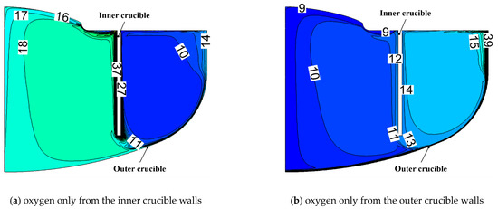The O distribution (ppma) in the melt: (a) there is no oxygen dissolved into the melt from the outer crucible and the inner crucible is the unique source of oxygen impurities, (b) there is no oxygen dissolved into the melt from the inner crucible and the outer crucible is the unique source of oxygen impurities.