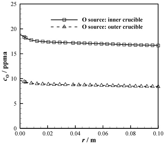 In Figure 5a, we show the O distribution in the melt for the case in which the outer crucible was covered by this virtual coating layer, which means that the inner crucible was the unique source of oxygen impurities in the melt. Compared with the results in Figure 3b, we found that the O concentration under the m-c interface only slightly decreased. Correspondingly, in Figure 5b, we show the O distribution in the melt for the case in which the inner crucible was covered by this virtual coating layer, which means that the outer crucible was the unique source of oxygen impurities in the melt. It is obviously found in this case that the O concentration under the m-c interface was remarkably reduced as compared to the results shown in Figure 3b and Figure 5a. In Figure 6, we compared the impact of the inner crucible and outer crucible on the oxygen distribution at the m-c interface. The results verified that the inner crucible can effectively prevent the O impurities dissolved from the outer crucible walls from being transported to the m-c interface, but the inner crucible itself acts as the dominant source of O impurities transported to the m-c interface. Therefore, the design of the inner crucible and control of the melt flow in the inner crucible are the key factors to reduce the O concentration at the m-c interface in the CCZ double-crucible method.