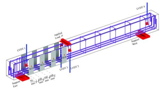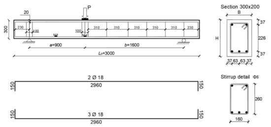 Table 1 reports distance from centre to centre between two consecutive strips sf and the width of the strips wf. All the beams were characterised by a rectangular cross-section (200 mm × 300 mm) and a length of 3000 mm. The RC beams were internally reinforced using three steel rebars with a nominal diameter of 18 mm in the longitudinal direction placed on the top (compression) and bottom (tension) sides. In order to assess the effects of the SRG system on the shear response of the beam, all the specimens were designed without transverse reinforcement in the shorter shear span (800 mm length), where the SRG system was applied (see Figure 3). In fact, the transverse reinforcement’s presence would contribute to the beam assembly’s shear response, thus not allowing a straightforward evaluation of the SRG system effectiveness. For this purpose, only the remaining part of the beam (shear span of 1600 mm length) was equipped with transverse reinforcement; the steel stirrups used had a nominal diameter of 8 mm (concrete cover of 20 mm).