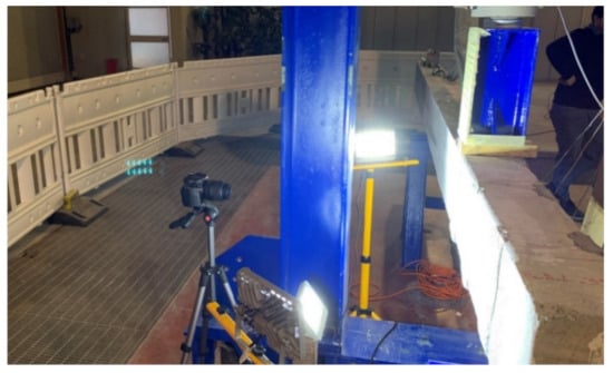 The freeware Matlab script Ncorr (Georgia Institute of Technology, Georgia, USA), developed by Blaber et al. [], was employed to process the acquired images. This technique has been adopted to obtain the strain contours at several load level. Furthermore, because the range of acquisition is synchronised to the load cell as well as the LVDTs, an additional measure of the load-displacement curves has been retrieved from the correlation of the digital images collected. Figure 2 shows a representation of the installed DIC system.