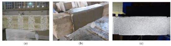 It is worth mentioning that for beams strengthened with two layers, the steps mentioned above must be repeated. After 28 days, the critical shear region of the beams (from now on referred to as “area of interest” (AoI)) was painted with a speckle pattern using a special brush and black ink; this pattern represents the ideal reference system for the DIC purpose (see Figure 4c).