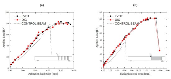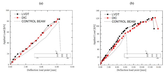 Figure 5 and Figure 6 show the load-deflection curves of the four tested beams. The black curves refer to the average displacement detected by using al LVDTs (placed at the loading point). In the same graphs, the red curves represent the response detected using DIC system. A picture at each load level was taken in order to monitor the front surface of AoI during the testing phases. The load curves obtained by using LVDT and DIC system were in good agreement. The performance between the two systems (LVDTs and DIC), are compared and the values of the deflection at the maximum load level are summarised in Table 2. Pu indicates the failure load, while δu indicates the corresponding deflection values (meaning the average of the two LVTDs at the load point).