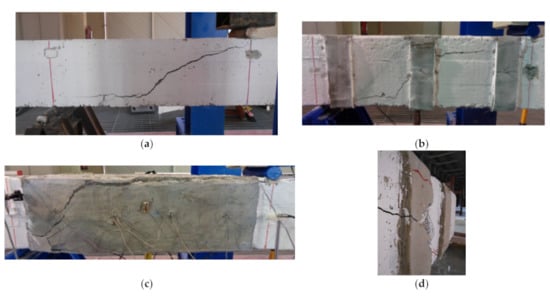 The un-strengthened beam and the strengthened beams failed in shear after the formation of a main diagonal crack in the shear zone (see Figure 7a). Concerning the reinforced beams, the main shear crack was clearly visible on the SRG jacket due to the mortar’s brittle response, which also reported a significant crack. Finally, the failure observed was due to the interlaminar failure that occurred inside the SRG U-wraps (Figure 7c).