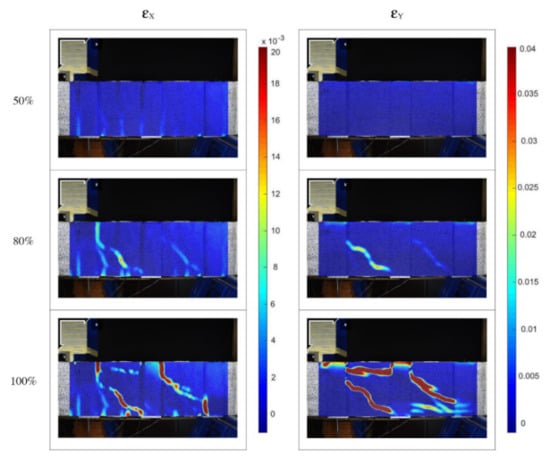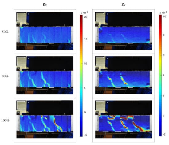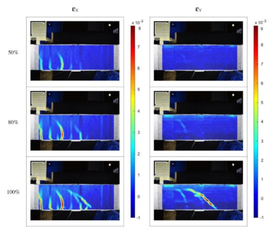 Figure 11 shows the strain maps of the U-Wrapped beam with a single strip and two layers. In this case, the FRCM surface showed a damage pattern more homogeneous than the previous ones. At the peak load, the vertical strains were well visible, following the shear deformation that occurs on the concrete support below the FRCM system.