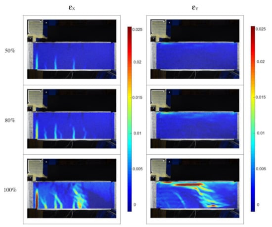 The DIC system was also employed to monitor the displacement field and consequently compute the strain contours developed during the loading process. This technique was employed to evaluate the local strains in the AoI of the beams, which present the following dimensions: 1 m long and the height is equal to the beam’s height. Three different loading stages were finally considered, namely 50%, 80% and 100% of the peak load. Figure 8, Figure 9, Figure 10 and Figure 11 show the evolution of the strain contour on the AoI surface, which describes the damage distribution during the loading stage.