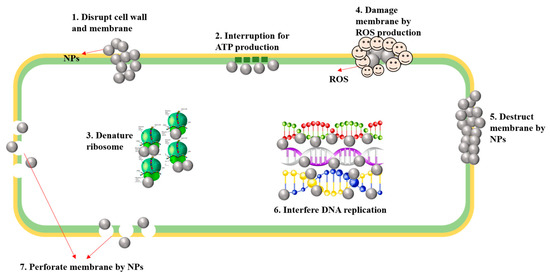 Nano-silver particles can release silver ions continuously, which is considered a main component to microbes. Silver ions have electrostatic attraction and affinity to sulfur proteins leading to adhere to cell wall and cytoplasmic membrane. The adhesive ions result in destruction of bacterial envelope through enhancing the permeability of cytoplasmic membrane. Then silver ions into cell promote the producing of reactive oxygen species, but interrupting the production of adenosine triphosphate. As previous mentioned, reactive oxygen species can cause cell membrane rupture and deoxyribonucleic acid (DNA) modification. In addition, silver ions can interact with sulfur- and phosphorous- containing compounds such as DNA, playing a role in impeding DNA replication, cell reproduction, leading to death of microorganisms. Moreover, silver ions can inhibit the synthesis of proteins by denaturing ribosomes in the cytoplasm [51].