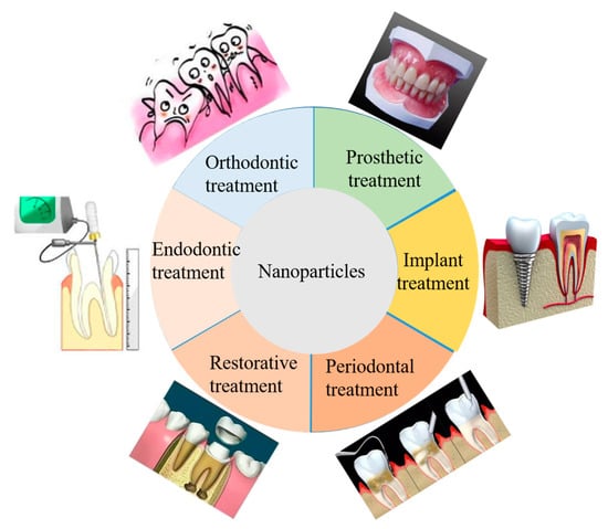 ROS-based nanoparticles have been adopted as efficient antibacterial materials and sterilization agents with no side effects. The nano-size and big ratio between surface area and volume of nanoparticles results in excellent efficacy with high antibacterial properties. In Table 2, we have discussed the common nanomaterials, their inferiorities and superiorities used in dentistry. It can improve the penetrability through the cell membrane; at the same time it can produce reactive oxide species. Many works have been done to study ROS-based nanoparticles used in dentistry. For instance, ROS-based silver nanoparticles can be used in prosthetic treatment, restorative treatment, endodontic treatment, adhesive materials in orthodontic treatment, as well as tissue regeneration in periodontal treatment [45]. The summary of nanoparticles used in dentistry is concluded in Figure 2.
