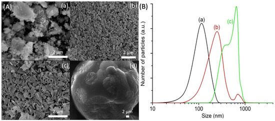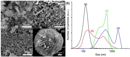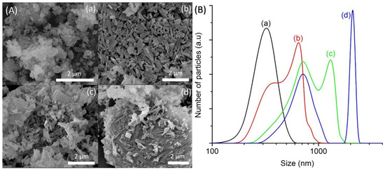 (A) Field emission scanning electron microscope (FESEM) images and (B) particle size distributions of (a) SH1, (b) SH3, (c) SH4 and (d) SH5 samples after heating at 150 °C for 2 h, 8 h, 10 h, and 14 h, respectively.