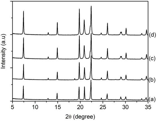 In this study, the effects of silica content (expressed in SiO2/Al2O3 molar ratio) were studied considering the significance and high tendency of silicon atoms insertion into the parent AlPO-5 during the crystallization process [30,31]. Hence, the hydrogels with a composition of 1Al2O3:2.5P2O5:2.5[bzmIm]2O:180H2O:zSiO2, where z = 0 (SH15), 0.23 (SH16), 0.47 (SH4) and 0.70 (SH17), were prepared. The XRD patterns of the samples were recorded and shown in Figure 9. Without adding any SiO2, the so-called AlPO-5 sample (SH15) showed an XRD pattern that perfectly matched with the AFI structure (Figure 9a). The diffraction peaks were broad, indicating small crystallite size, and it could be confirmed from the FESEM image that showed secondary micron-sized particles with layered morphology formed by agglomerated nanocrystals (mean size of 170 nm) (Figure 10A(a),B(a)). The phase purity remained the same when the Si content was increased to z = 0.23, 0.47, and 0.7, but a significant change in crystal size and morphology was observed (Figure 10A(b–d)). As seen, the SAPO-5 crystals tended to grow in c-direction when more Si atoms were incorporated, forming hexagonal prism crystals with an elongated shape and intergrown structure. As a result, the mean particle size of SAPO-5 increased from 260 nm (z = 0.23) to 650 nm (z = 0.47) before reaching to 4.2 µm (z = 0.7) (Figure 10B(b–d)).