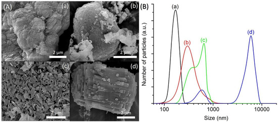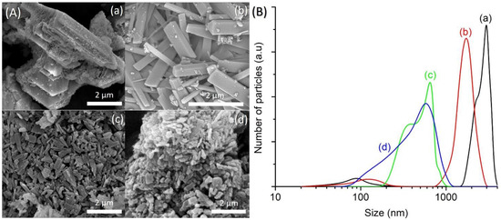 The FESEM images of SH1, SH3, SH4 and SH5 were also captured to study the crystallization process of SAPO-5. SH1 sample was formed by the agglomerated and irregular-shaped particles, confirming the amorphous nature of this sample (Figure 2A(a)). The particle size distribution (PSD) of SH1 was plotted and a monomodal curve centered at 120 nm was obtained (Figure 2B(a)). This peak was shifted to larger particle sizes after 8 h, indicating amorphous phase reorganization as proven by the XRD analysis (Figure 2B(b)). In addition, another PSD centered at 500 nm was also observed, thus showing the presence of two different phases in SH3 sample. As seen, SH3 sample was a semi-crystalline solid with the SAPO-5 crystals of hexagonal prism shape growing on the amorphous entities (Figure 2A(b)). At 10 h, the small amorphous solids disappeared, and the SAPO-5 crystals grew further (mean size: 650 nm), as confirmed by the FESEM and PSD studies (Figure 2A(c),B(c)). Successive phase transformation of SAPO-5 into SAPO-41 was also observed in SH5 after 14 h of heating where larger secondary particles made by agglomerated primary crystals of SAPO-5 and SAPO-41 (both in hexagonal prism shape [18,19]) were detected (Figure 2A(d),B(d)).