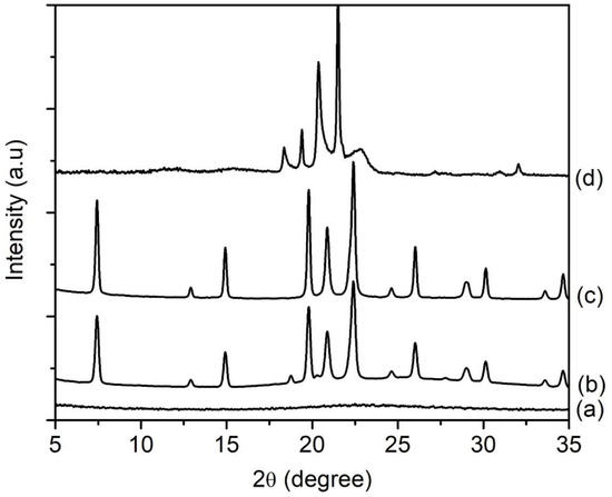 XRD patterns of (a) SH9 (x = 1.5), (b) SH10 (x = 2.0), (c) SH4 (x = 2.5) and (d) SH11 (x = 3.0) where the solid products were prepared using precursor hydrogels with a molar composition of1Al2O3:xP2O5:x[bzmIm]2O:180H2O:0.47SiO2 at 150 °C for 10 h.