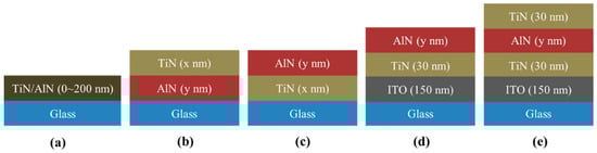 Schematic structure of (a) glass/titanium nitride (TiN) (0~200 nm) and glass/aluminum nitride (AlN) (0~200 nm), (b) multilayer A (glass/AlN (y nm)/TiN (x nm)), (c) multilayer B (glass/TiN (x nm)/AlN (y nm)), (d) M1 (glass/indium tin oxide (ITO) (150 nm)/TiN (30 nm)/AlN (30 nm)) and M2 (glass/ITO (150 nm)/TiN (30 nm)/AlN (50 nm)), (e) M3 (glass/ITO (150 nm)/TiN (30 nm)/AlN (30 nm)/TiN (30 nm)), and M4 (glass/ITO (150 nm)/TiN (30 nm)/AlN (50 nm)/TiN (30 nm)).