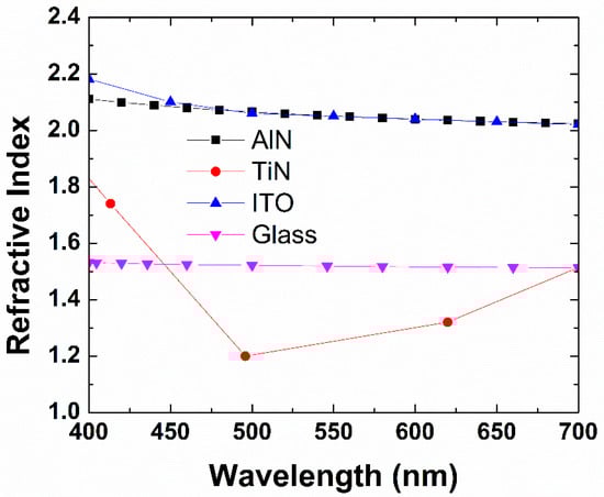 The simulation analysis was made based on the refractive index of the materials provided in the database of Essential Macleod software. The reported refractive index of AlN, TiN, ITO, and glass within visible range is shown in Figure 2. The refractive index at 510 nm for glass, ITO, TiN, and AlN is 1.5, 2.1, 1.2, and 2.1, respectively. The nitrides exhibit a refractive index difference of 0.9 at 510 nm, which is suitable for thin film multilayer interference. Generally, AlN exhibits similar refractive index characteristics with ITO, while that of TiN is lower than glass, especially for incident beams with wavelengths between 450 and 700 nm.