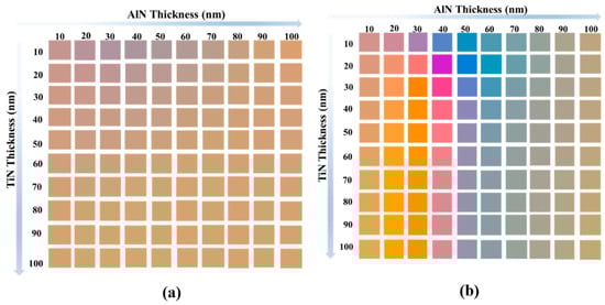 The effect of the multilayer structure on the thin film interference using computer simulation based on wave optics is further investigated. Glass/AlN/TiN and glass/TiN/AlN multilayers, herein referred to as Multilayer A and Multilayer B, respectively, have been investigated. The schematic structures of Multilayer A and Multilayer B are shown in Figure 1b,c respectively. For Multilayer A, light traverses air, through to the TiN layer. Since the refractive index of TiN is higher than air, the reflection that occurs at the air–TiN boundary of the film introduces a 180° phase shift in the reflected wave [19,20,21]. Part of the beam is then transmitted through the AlN layer and is similarly reflected with a phase shift. Similar interferences occur at the AlN–glass and glass–air boundaries. However, there is no phase shift in the reflected light at the AlN–glass boundary, since the beam travels from a medium with a higher refractive index into a medium with a lower refractive index. In Multilayer B, reflections occur for some wavelengths at the air–AlN, AlN–TiN, TiN–glass, and glass–air interfaces, respectively. The remaining light is transmitted sequentially through a series of alternating layers with low and high refractive index, respectively. Thus, the optical path traversed by the transmitted beam differs in the two multilayer structures. The reflected waves, which are generated at each interface within the multilayer, interact and produce a resultant reflected light wave. The intensity of the net reflected light depends on the optical thickness of the film. By varying the optical path via the thickness control and structure of the multilayer, the peaks in the reflectance or the transmittance spectra can be shifted to achieve a desired color film [19,20,21]. The simulated color profiles for Multilayer A and Multilayer B are shown in Figure 4, respectively.