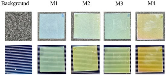 The TiN layer has a refractive index lower than glass, which makes it difficult to achieve several color films with glass/TiN/AlN. As such, for lab scale fabrication and demonstration, ITO-coated glass substrates were used. Four color glass derivatives of Multilayer B, herein referred to as M1, M2, M3, and M4, were fabricated based on ITO-coated glass/TiN (30 nm)/AlN (30 nm), ITO-coated glass/TiN (30 nm)/AlN (50 nm), ITO-coated glass/TiN (30 nm)/AlN (30 nm)/TiN (30 nm), and ITO-coated glass/TiN (30 nm)/AlN (50 nm)/TiN (30 nm) multilayers, respectively. The schematic structure of M1 and M2 are shown in Figure 1d, while that of M3 and M4 are shown in Figure 1e, respectively. The actual photographs of the fabricated M1, M2, M3, and M4 color glasses are shown in Figure 5. The photographs of the samples were taken on two backgrounds, black surface and solar cell, respectively.