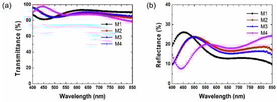(a) Transmittance and (b) relative reflectance spectra of M1, M2, M3, and M4 color glasses.