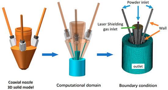 A realistic coaxial discrete three beam nozzle was used as the research object. After modeling the nozzle, the powder passage, a part of the inner laser shielding gas passage, inside nozzle, and a reasonable range of powder flow area outside the nozzle were taken as the calculation domain. The boundary conditions of the calculation domain were set according to a realistic situation. The modeling process is shown in Figure 1. The boundary condition was set as follows: the inlet type is the velocity inlet, the outlet type is the pressure outlet, and the remaining parameters concern the wall, with an elasticity coefficient of 0.99. A set of standard parameters were set, shown in Table 2.