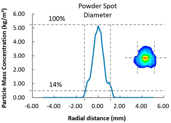 The diameter of the powder spot was calculated by taking 14% of the peak concentration of the powder spot as the boundary. The calculation process of powder stream focus spot diameter under standard parameters is shown in Figure 2 as an example. This definition is used to ensure quantifiable contrast of simulation results.