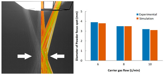 Comparison of simulation and experimental results of the powder spot diameter.