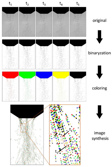 In order to obtain the velocity of the particle, the powder stream was photographed with a high-speed camera of 10,000 frames per second. As shown in Figure 4, t1 to t5 are five images of the powder stream with a framerate of 10−4 s. Through binarization and colors of the five photos, they are combined into one image. By measuring the distance between the positions of the particles at different times in the composite image, the velocity of the particles can be measured. In this method, the measured particle velocities under different parameters are compared with the simulated results in Figure 5. It also shows that the simulation results are in good agreement with the experimental results. Furthermore, since the image can only obtain two-dimensional information, the comparison of velocity is only conducted by two-dimensional vectors, which is less than the maximum particle velocity of the numerical simulation results.