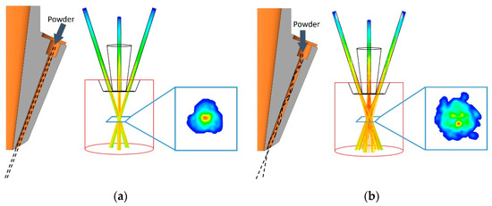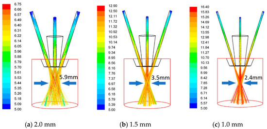 As shown in Figure 6a, when the powder is incident parallel to the passage, the powder is only dragged by the gas flow moving along the passage, resulting in the same diameter of the powder flow at the nozzle outlet as at the incident diameter. An ideal Gaussian distribution can be formed at the focal point of the powder stream. The diameter of the spot can even be calculated by simple geometric formula, but this result is obviously not convincing.