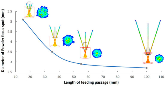 Through the simulation of nozzle structure from 15 mm to 100 mm in passage length, it is found that the diameter of the powder focus spot can be reduced from 5.1 mm to 2.6 mm, accompanied by a more uniform powder concentration distribution. Nevertheless, this process presents a logarithmic curve change, that is to say that, excessively increasing the passage length will not lead to a more obvious decrease in the size of powder spots, but the size of powder spots will approach a certain limit value, as shown in the curve in Figure 7.