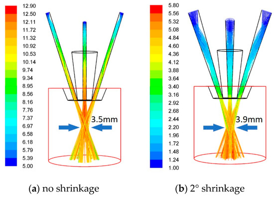 Powder focus spot diameters with and without passage shrinkage. (a) no shrinkage; (b) 2° shrinkage.